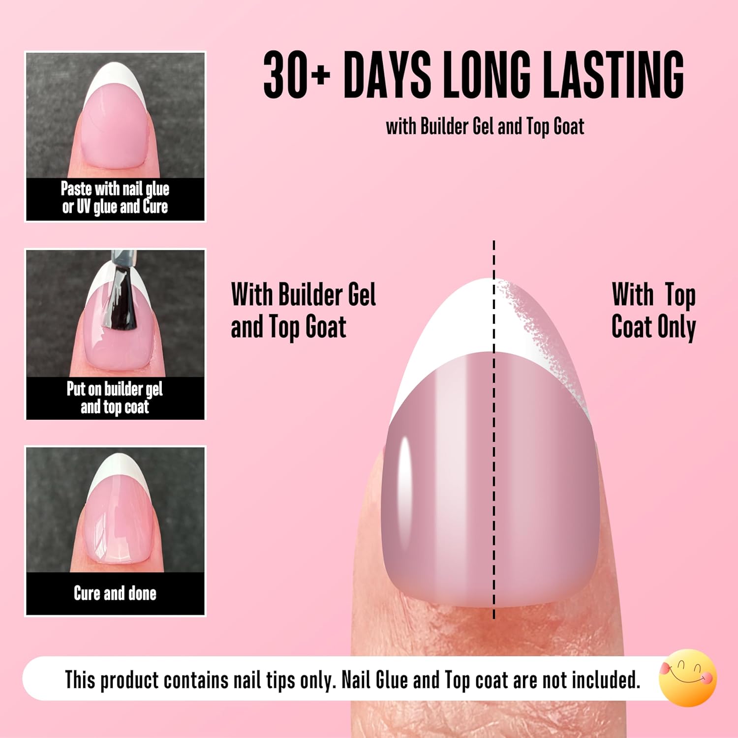 - GET A SIMPLE SHORT FRENCH TIP ALMOND NAIL MANICURE WITH JUST 3 STEPS: NOVO OVO pre-designed nails are here to make your manicure easier! We've already applied a tip primer and base coat on the soft gel nail tips. Simply stick them on your nails with UV glue or press on nail glue, then add a layer of builder gel and top coat. In just 15 minutes, you'll have stunning French Tips almond nails on your hand!
