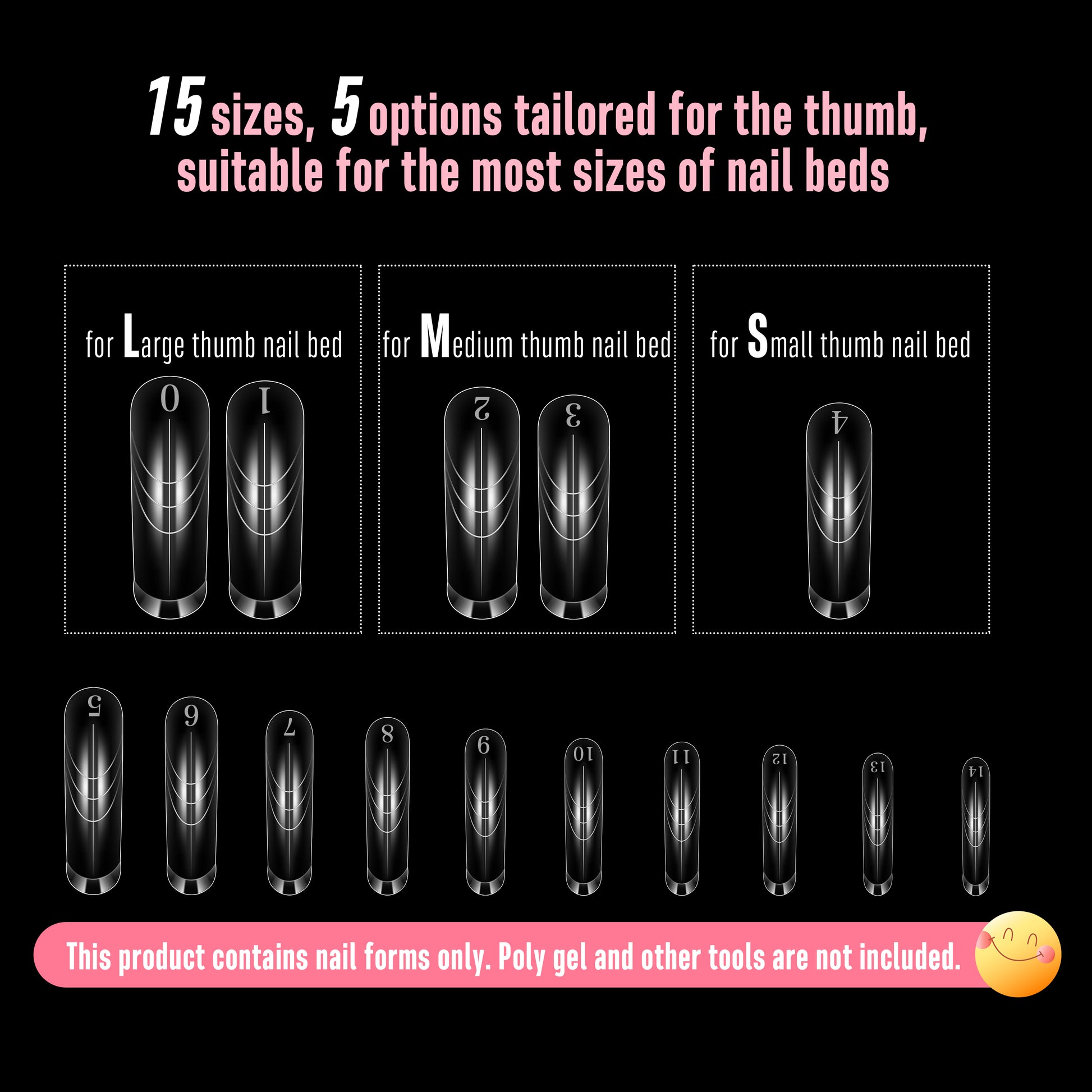 - 15 SIZES TO ACCOMMODATE EVERY NAIL TYPE : Unlike traditional reusable forms that typically offer only 12 sizes, our innovative collection boasts 15 unique sizes, including five options specifically crafted for thumb applications. This versatility caters to a wide audience, ranging from petite and small nail beds to broader and wider hands. Our dual forms are suitable for almost anyone, including some men with medium and small hands.