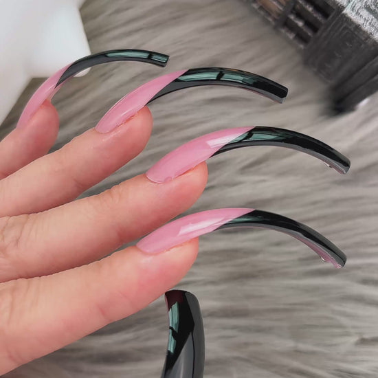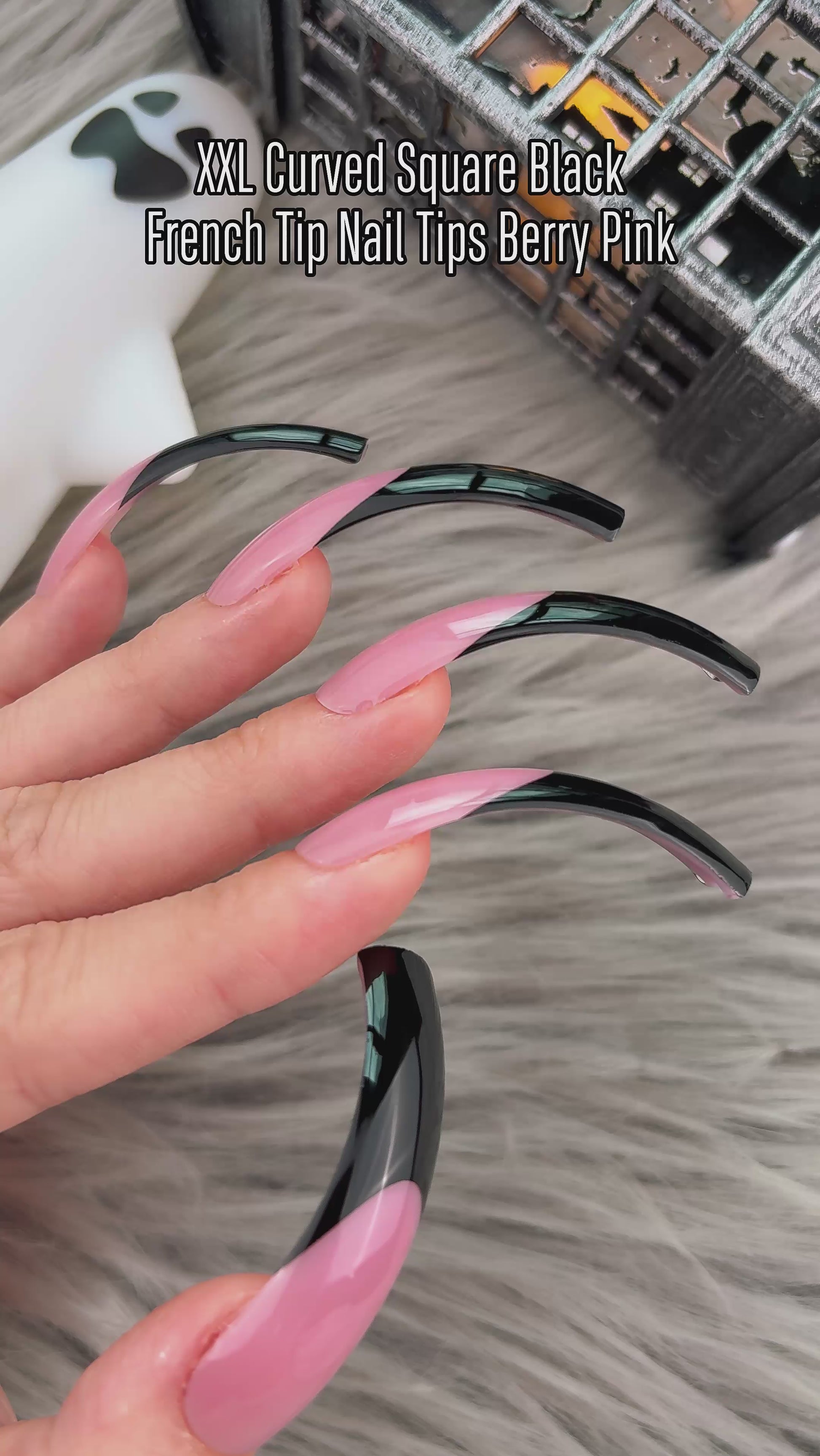 - XXL CURVED SQUARE BLACK FRENCH TIP NAILS WITH COMPLETE COVERAGE:Our nail tips are uniquely designed with a length range from 1.89 inch to 1.69 inch (48mm to 46mm)from the largest tip to the smallest tip. You can easily cut and trim them to your desired length, whether it's XS, short, or medium, while still maintaining the natural curve. Just apply builder gel and top coat you will get a stunning french tip manicure.