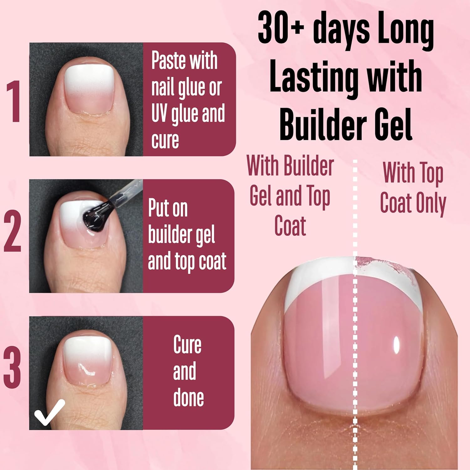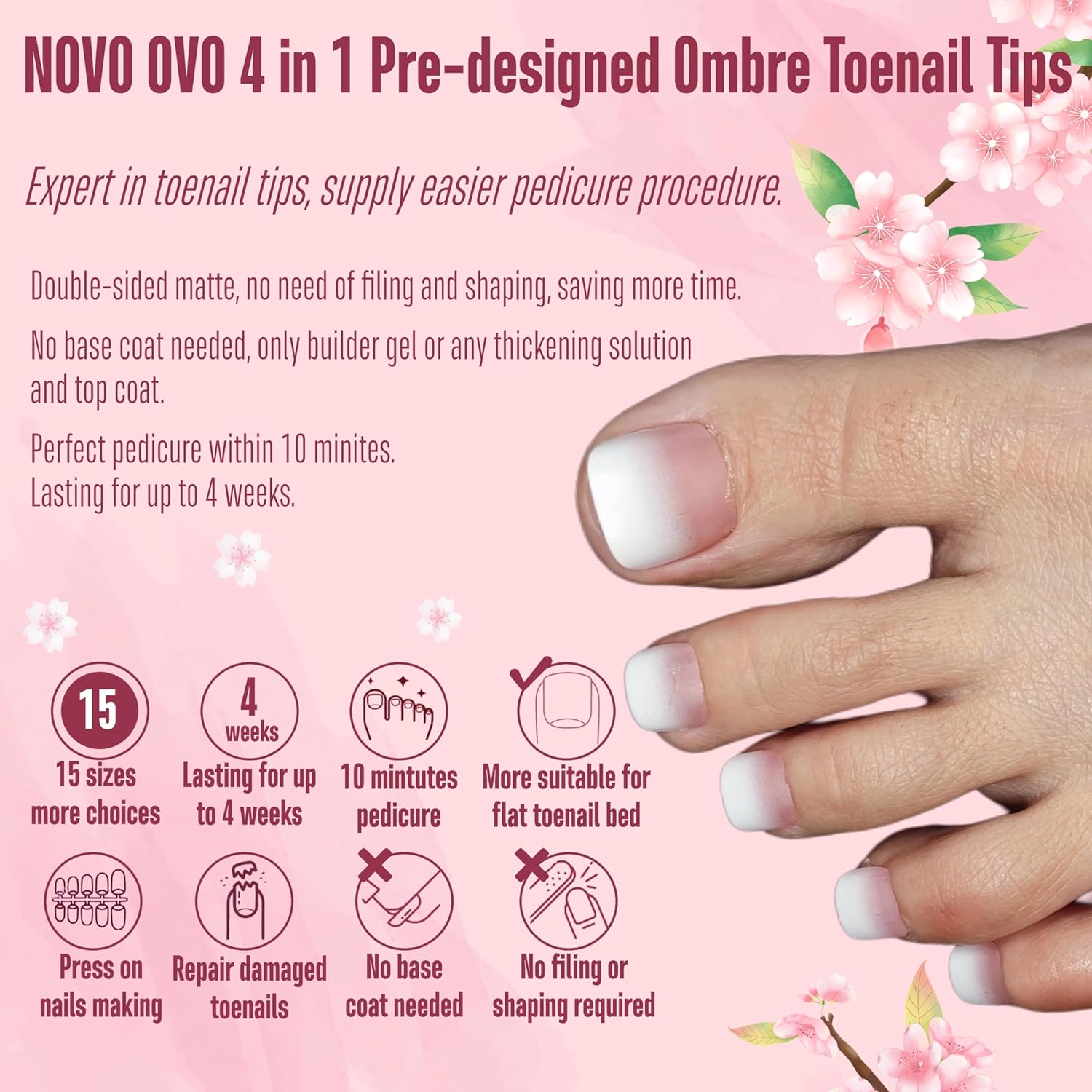 - 【GET THE PERFECT FRENCH TIP OMBRE PEDICURE WITH JUST A FEW SIMPLE STEPS!】NOVO OVO pre-designed nails are here to make your pedicure easier! We've already applied a tip primer and base coat on the soft gel nail tips. Simply stick them on your nails with UV gel or glue, then add a layer of builder gel and top coat. In just 15 minutes, you'll have stunning french tips on your toenails!