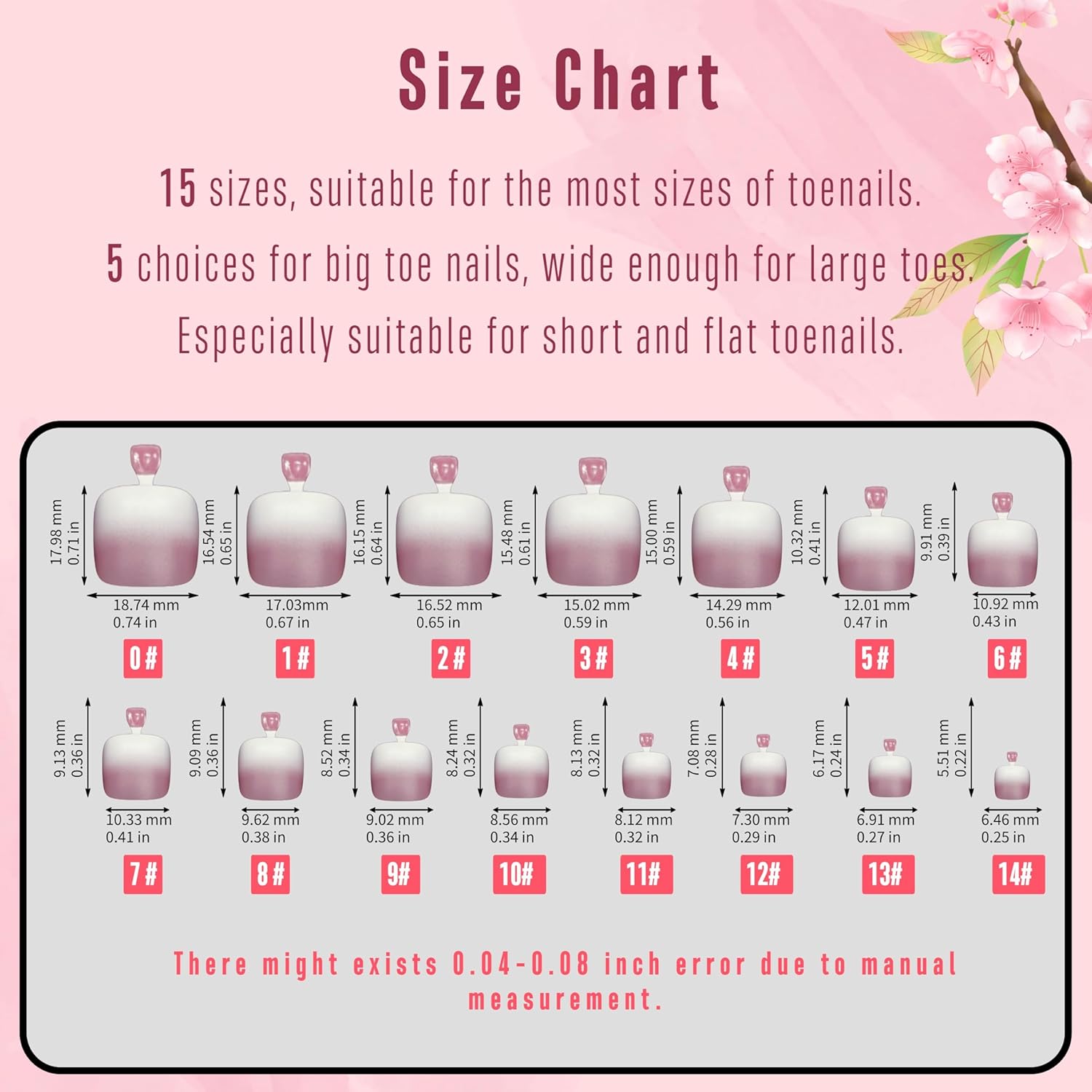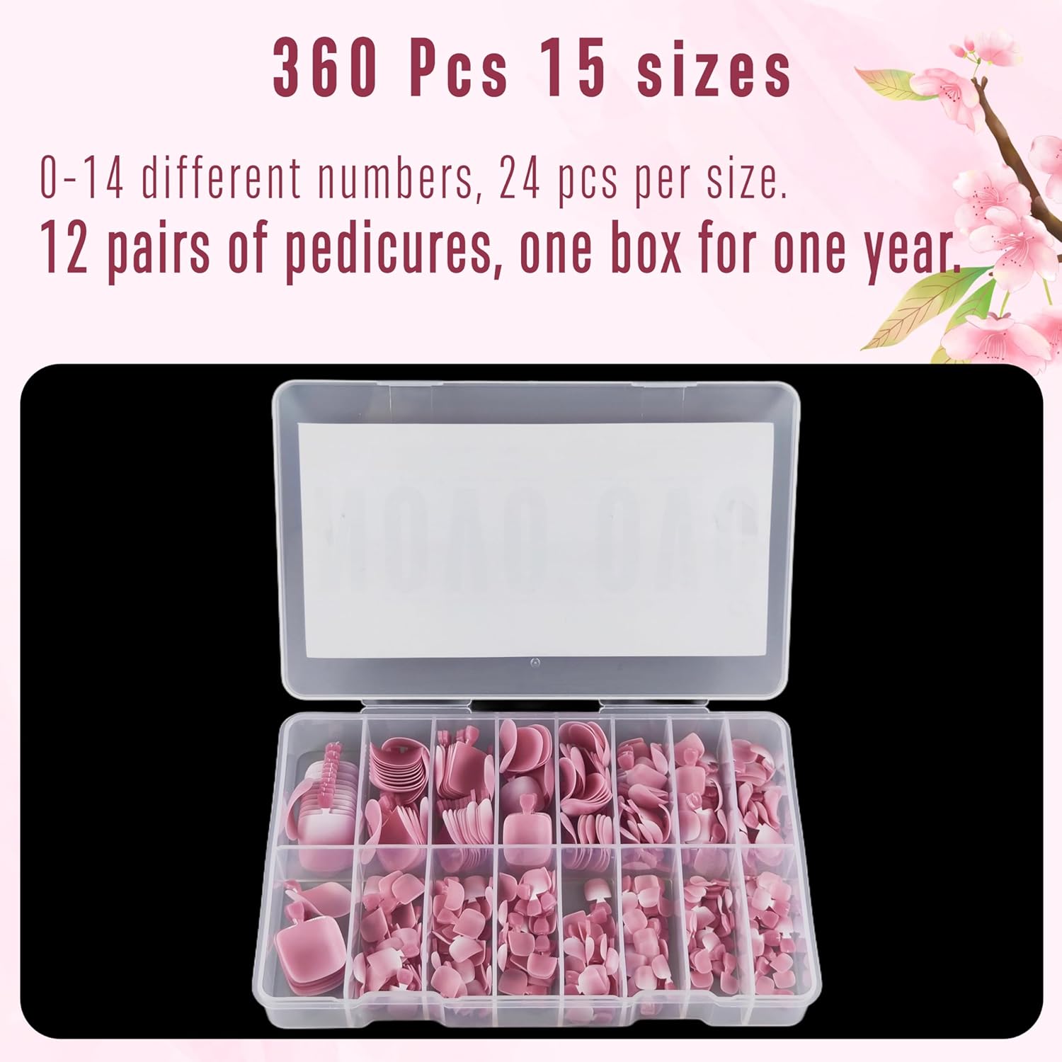 - 【FIND YOUR PERFECT FIT】We understand that one size doesn't fit all. That's why our nail tips come in 15 different sizes for your toes and 5 size options specifically for your big toe (hallux). Whether you have wide toes or not, our nail tips are suitable for various feet sizes. With 360 pieces, you'll have enough for at least 12 perfect pedicures!