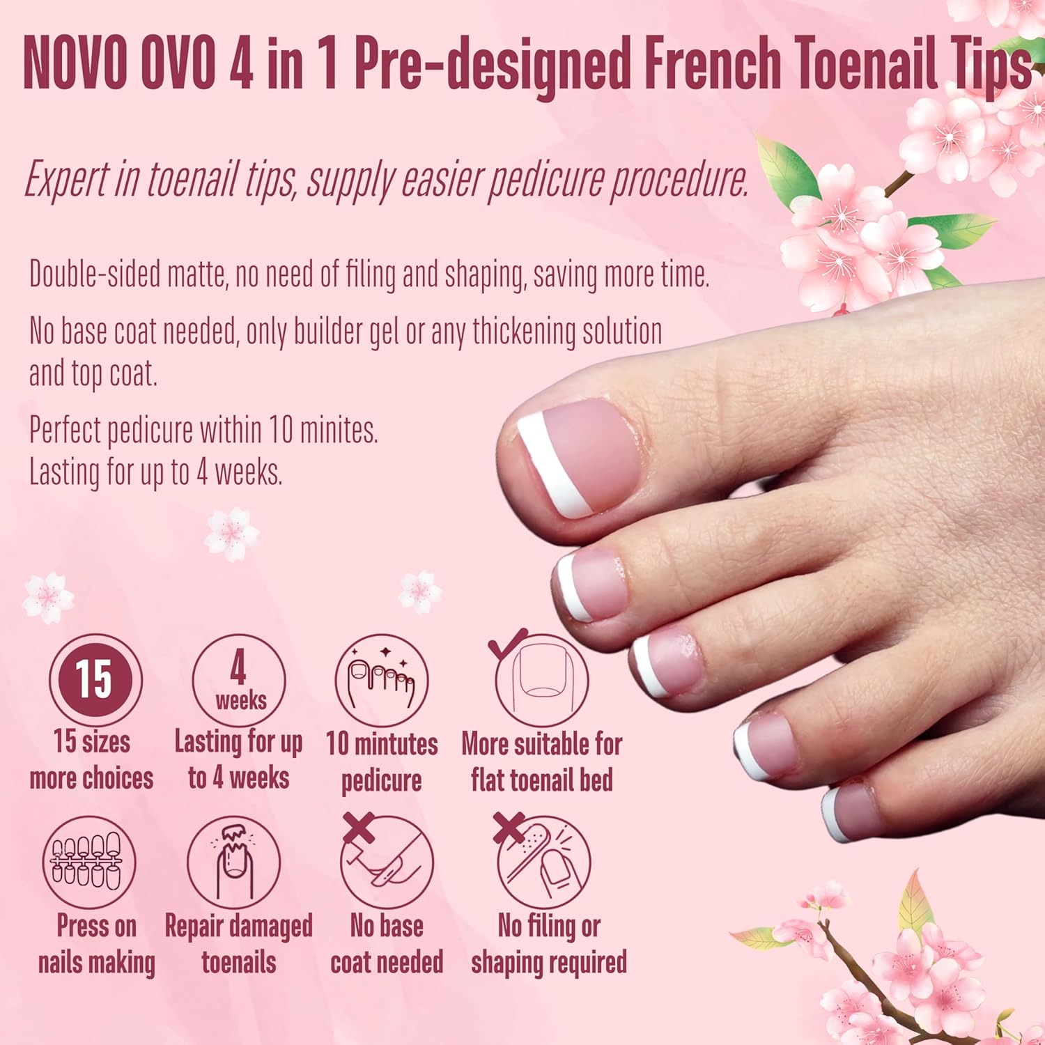 - 【GET THE PERFECT FRENCH TIP PEDICURE WITH JUST A FEW SIMPLE STEPS!】NOVO OVO pre-designed nails are here to make your pedicure easier! We've already applied a tip primer and base coat on the soft gel nail tips. Simply stick them on your nails with UV gel or glue, then add a layer of builder gel and top coat. In just 15 minutes, you'll have stunning french tips on your toenails!