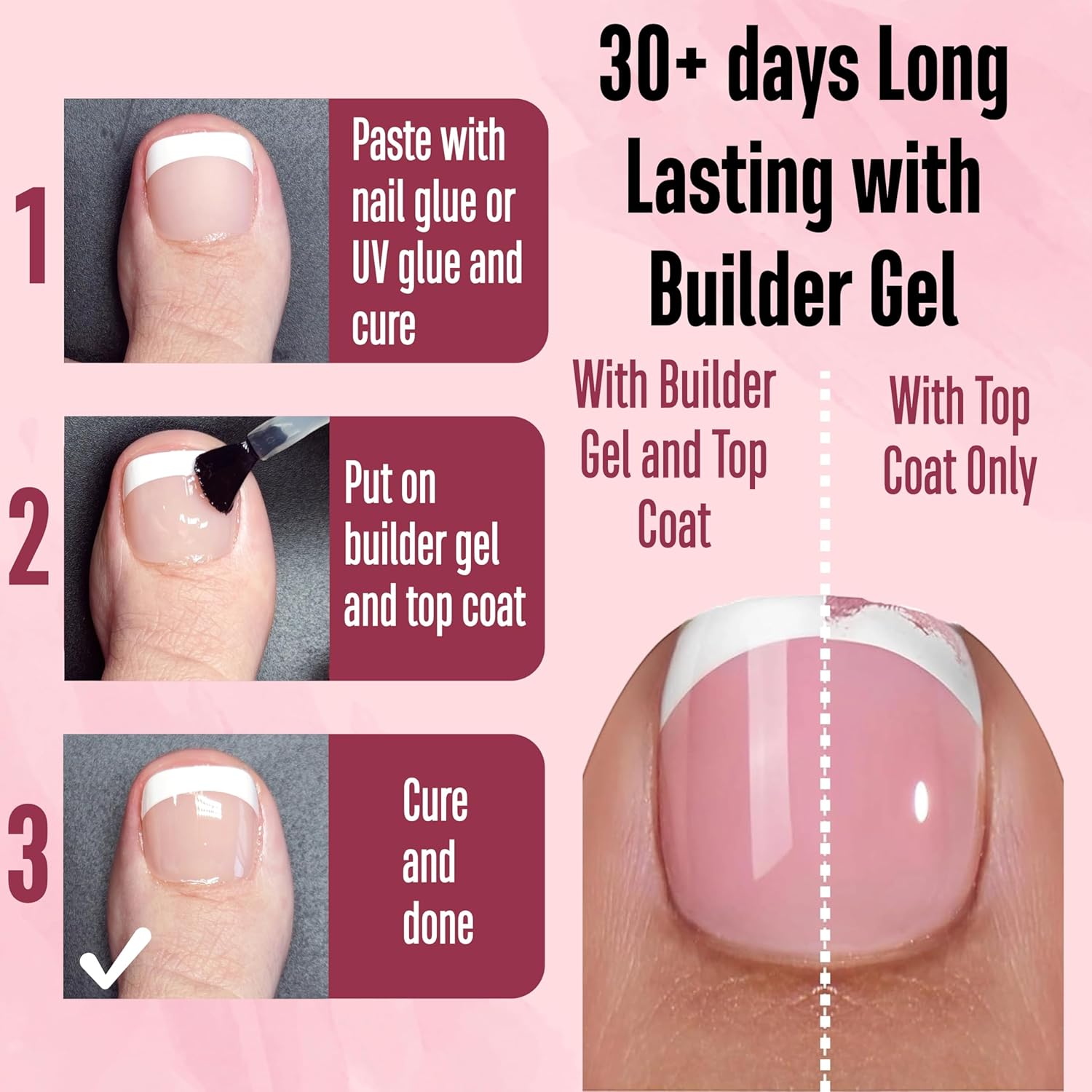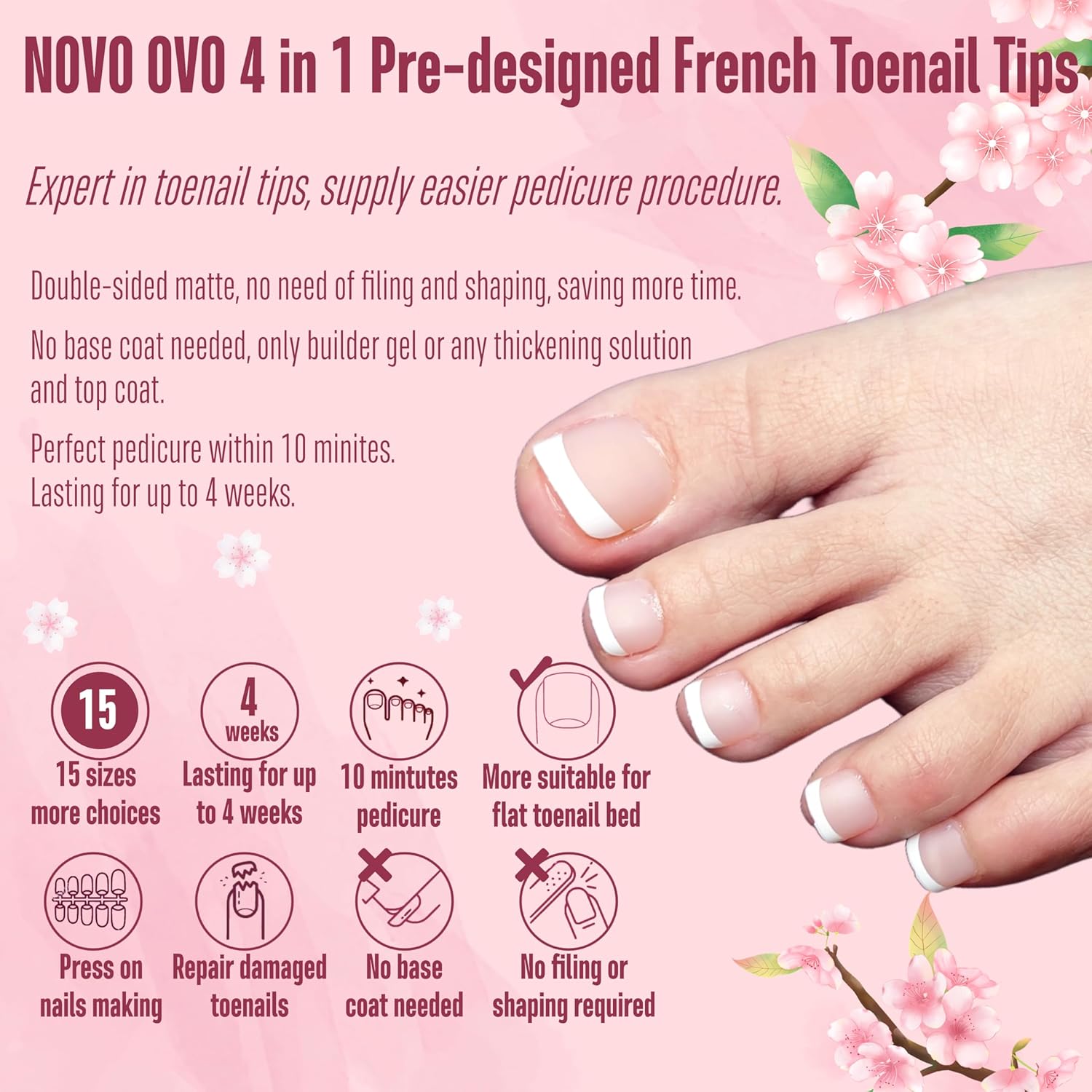 - 【GET THE PERFECT FRENCH TIP PEDICURE WITH JUST A FEW SIMPLE STEPS!】NOVO OVO pre-designed nails are here to make your pedicure easier! We've already applied a tip primer and base coat on the soft gel nail tips. Simply stick them on your nails with UV gel or glue, then add a layer of builder gel and top coat. In just 15 minutes, you'll have stunning french tips on your toenails!