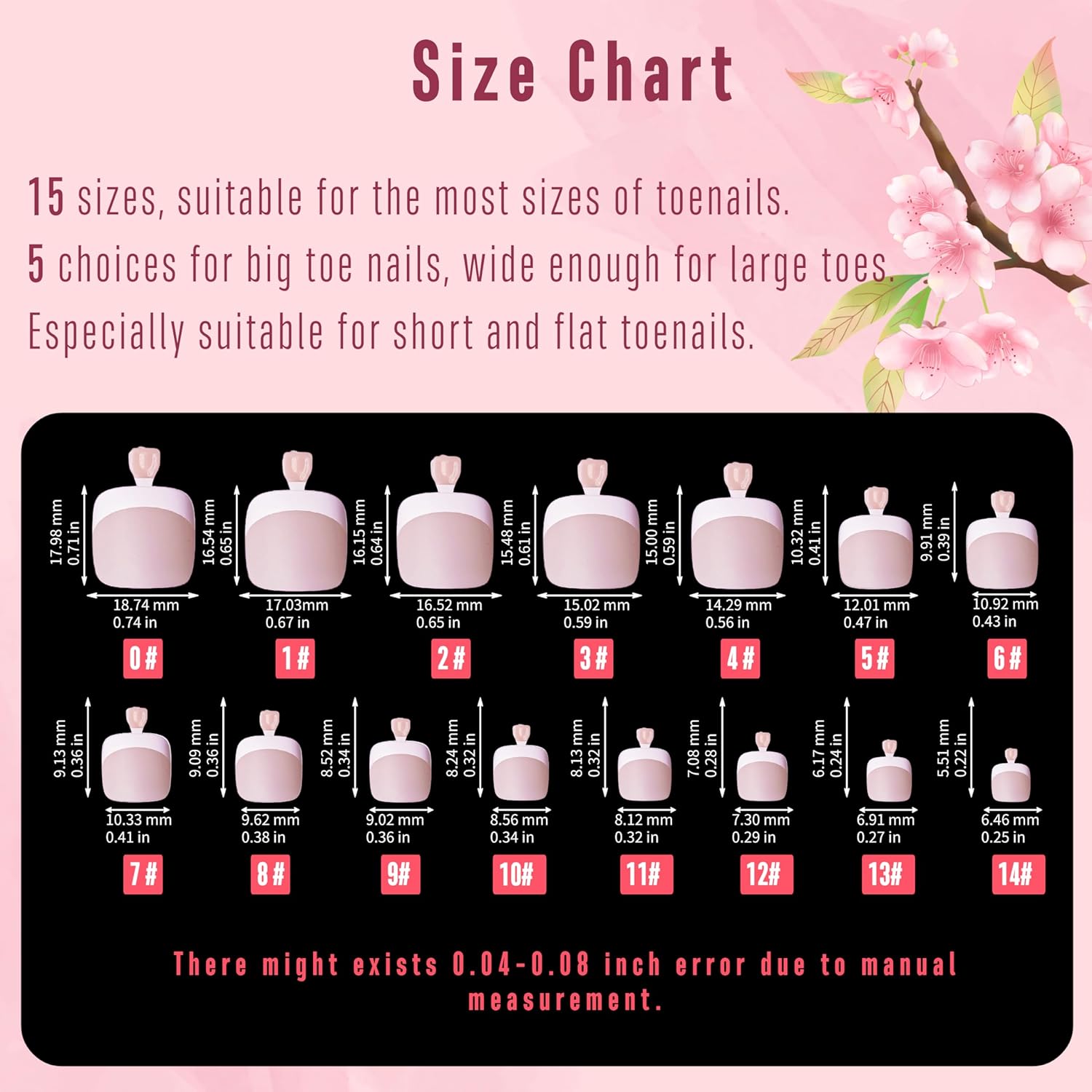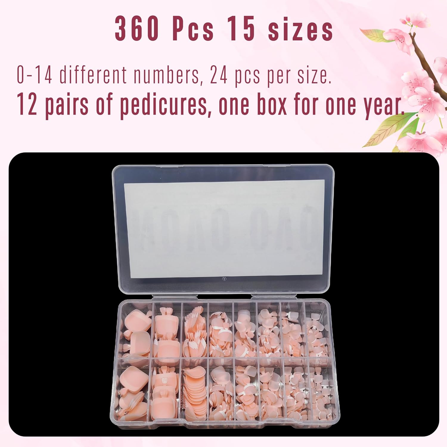 - 【FIND YOUR PERFECT FIT】We understand that one size doesn't fit all. That's why our nail tips come in 15 different sizes for your toes and 5 size options specifically for your big toe (hallux). Whether you have wide toes or not, our nail tips are suitable for various feet sizes. With 360 pieces, you'll have enough for at least 12 perfect pedicures!