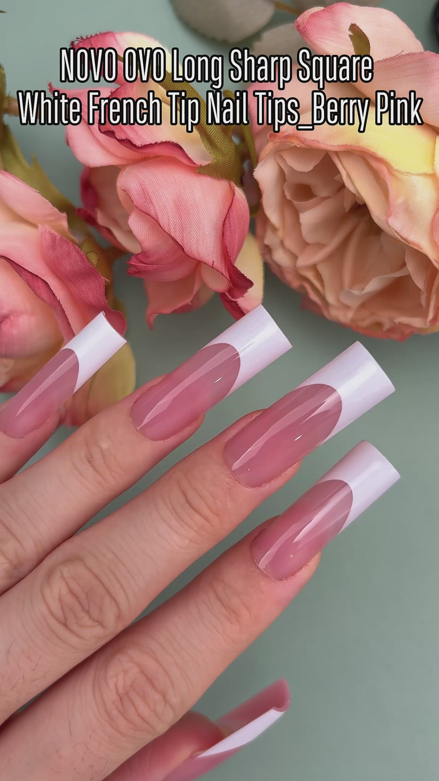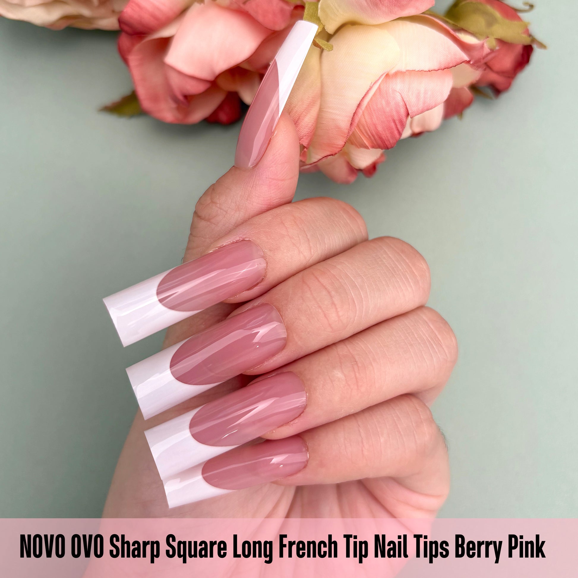 NOVO OVO Long Sharp Square White French Tip Nail Tips Press on BERRY PINK, Extra Thick NEED Builder Gel & Top Coat & Glue, Soft Gel full Cover False Fake Nail Extension for Salon DIY x 15 Sizes 180 pc