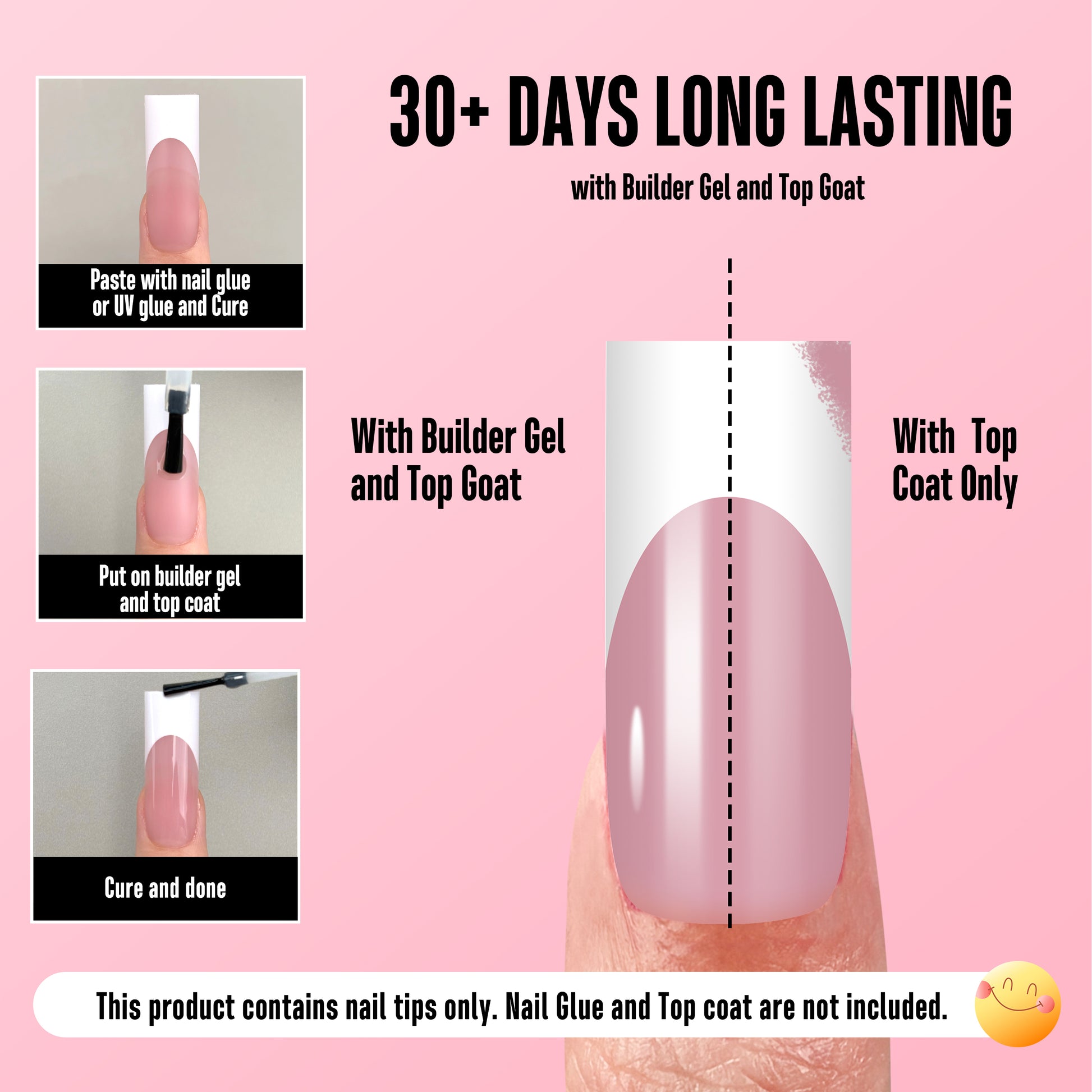 CRAFTED FROM PREMIUM SOFT GEL: Made with a special high-quality PMMA formula, these nail tips are ultra-transparent and leave no marks after bending. They can be easily pressed, trimmed, and painted, compatible with nail polish, dip powder, and acrylic powder, enabling you to achieve salon-quality manicures and press-on nails. Plus, they soak off easily—no need to worry about over-filing when removing extensions.