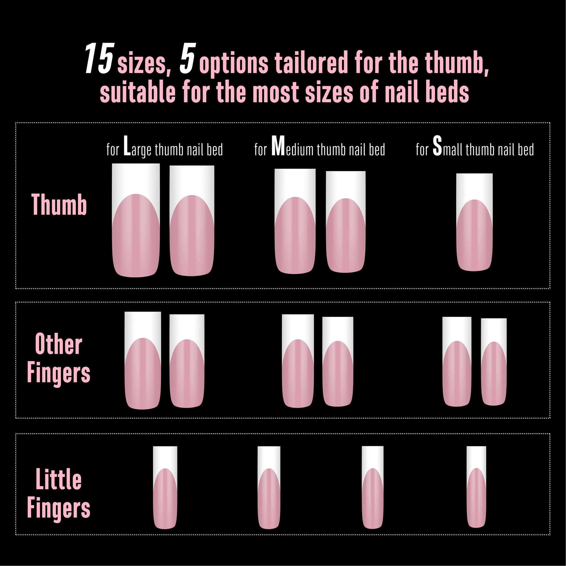 EXTENSIVE SIZE VARIETY: Our nail tips come in 15 distinct sizes, thoughtfully crafted to fit a spectrum of nail beds, whether broad or petite. The longest finger tip measures an ample 1.23 inch (33mm), while the remaining tips are proportionally shorter. Some people may call them Medium, Long or XXL. Should you desire even less length, simply file to your preferred size.