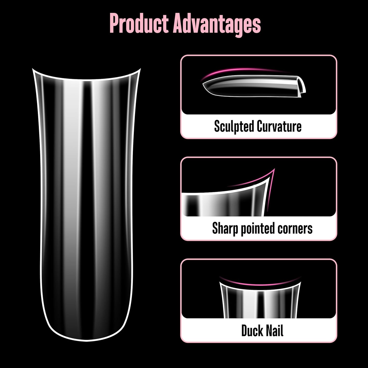 WORLD FIRST LONG XL SCULPTED DUCK NAIL TIPS WITH MOON CURVE : after provided 10 kinds of different duck nail tips or dual forms, from half cover to full coverage, from short length to medium, long,XL XXL. We designed this XL duck nail tips with MOON CURVE to eliminate the need for time-consuming filing, allowing you to easily create stunning designs.