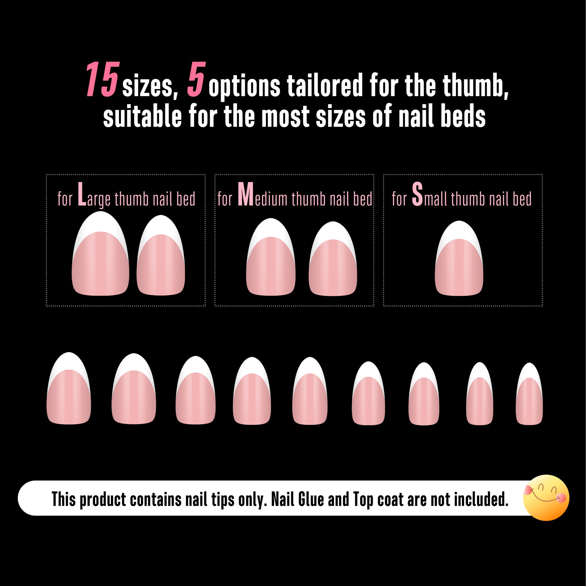 - EXTENSIVE SIZE VARIETY: Our nail tips come in 15 distinct sizes, thoughtfully crafted to fit a spectrum of nail beds, whether broad or petite. For the cuticle part, we provide a square shape for the thumbs and a rounded design for the rest, eliminating the hassle of reshaping and giving you more time to focus on your artistry.