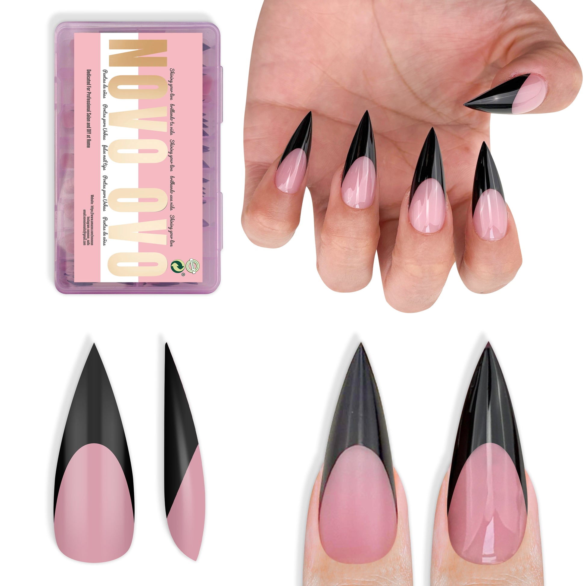 GET A SIMPLE FRENCH TIP SHARP STILETTO THICK MEDIUM / LONG NAIL TIPS MANICURE WITH JUST 3 STEPS: NOVO OVO pre-designed nails are here to make your manicure easier! We've already applied a tip primer and base coat on the soft gel nail tips. Simply stick them on your nails with UV glue or press on nail glue, then add a layer of builder gel and top coat. In just 15 minutes, you'll have stunning French Tips Sharp Stiletto nails on your hand!