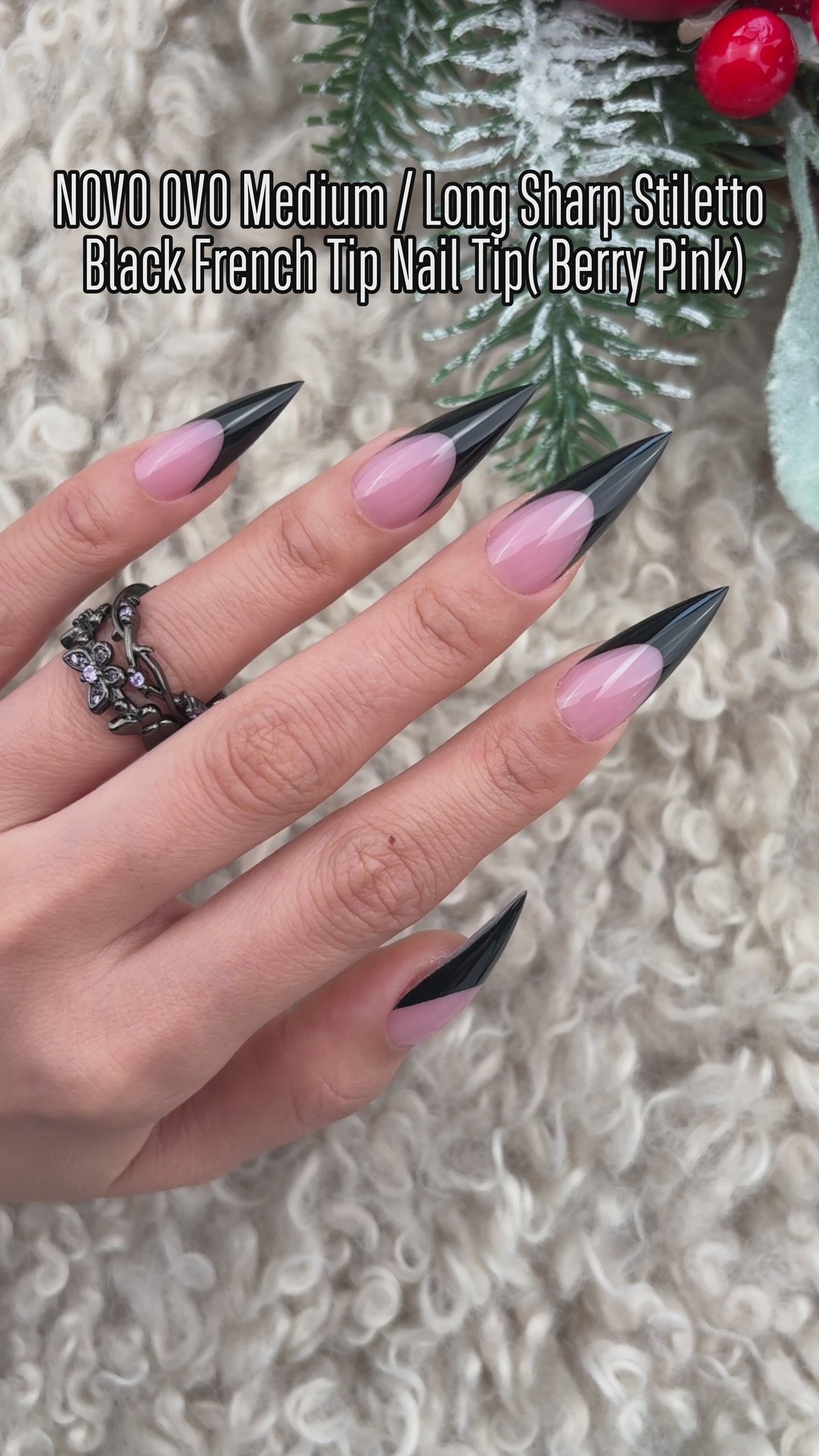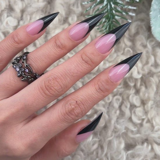 Medium or Long Black French Tip Sharp Stiletto Nail Tips Berry Pink