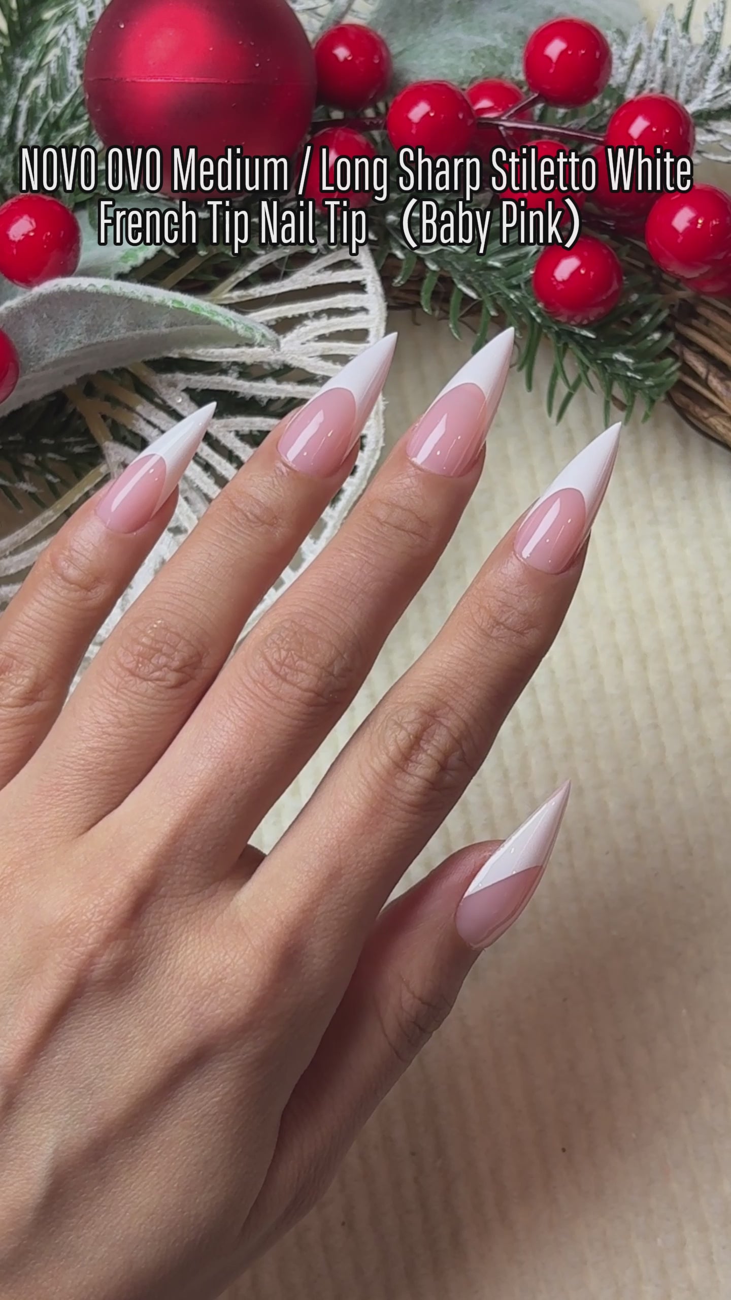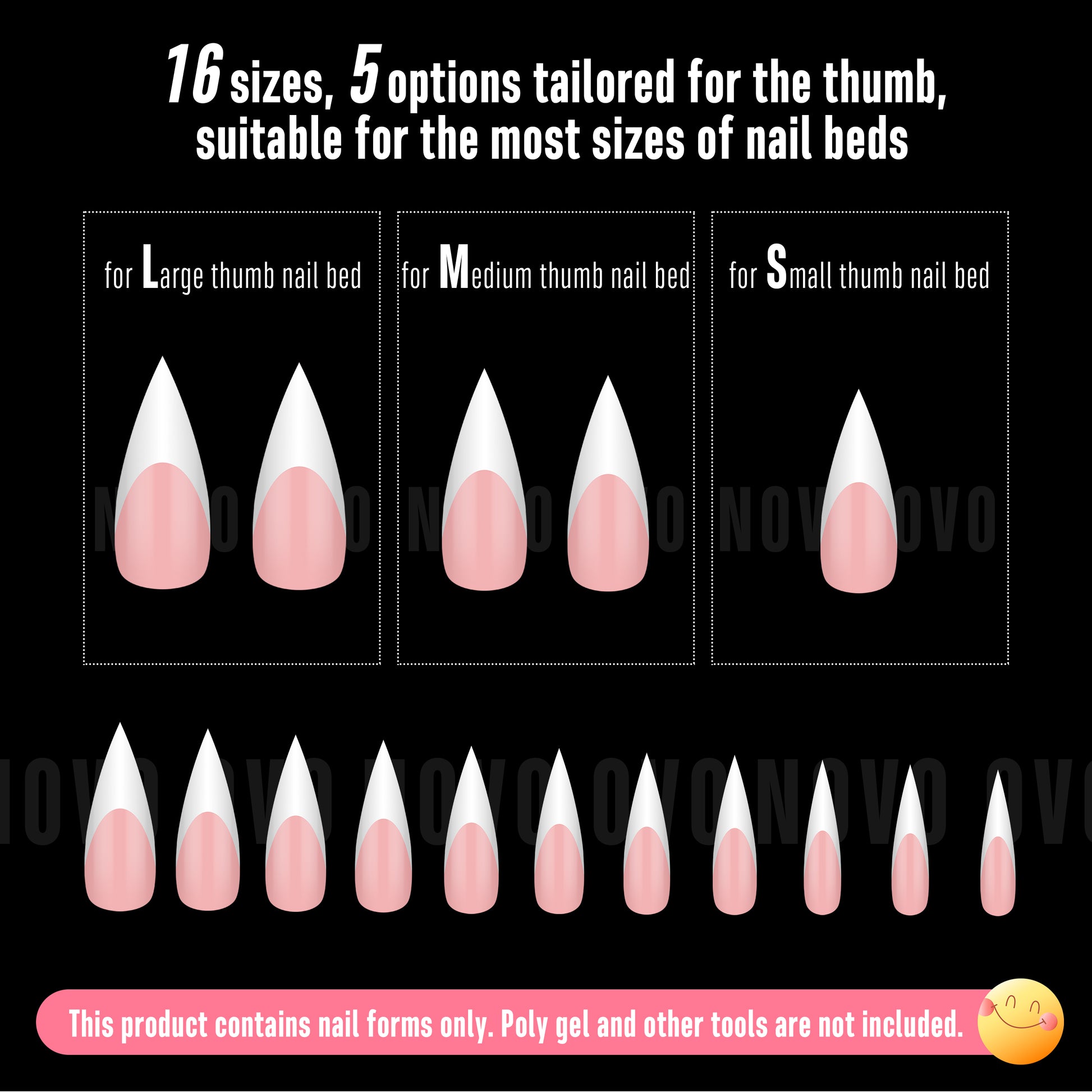 GET A SIMPLE FRENCH TIP SHARP STILETTO THICK MEDIUM / LONG NAIL TIPS MANICURE WITH JUST 3 STEPS: NOVO OVO pre-designed nails are here to make your manicure easier! We've already applied a tip primer and base coat on the soft gel nail tips. Simply stick them on your nails with UV glue or press on nail glue, then add a layer of builder gel and top coat. In just 15 minutes, you'll have stunning French Tips Sharp Stiletto nails on your hand!