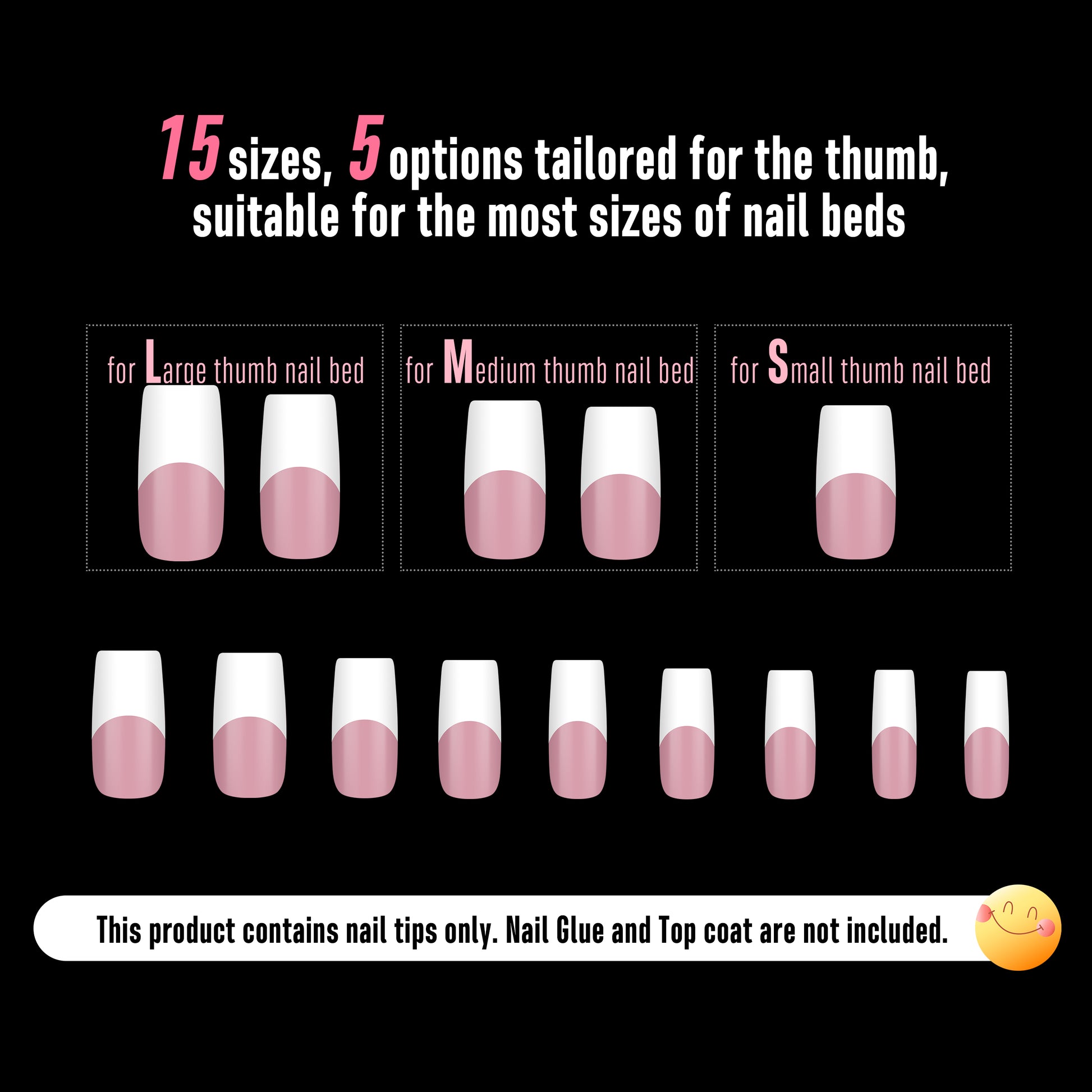 - EXTENSIVE SIZE VARIETY: Our nail tips come in 15 distinct sizes, thoughtfully crafted to fit a spectrum of nail beds, whether broad or petite. For the cuticle part, we provide a square shape for the thumbs and a rounded design for the rest, eliminating the hassle of reshaping and giving you more time to focus on your artistry.