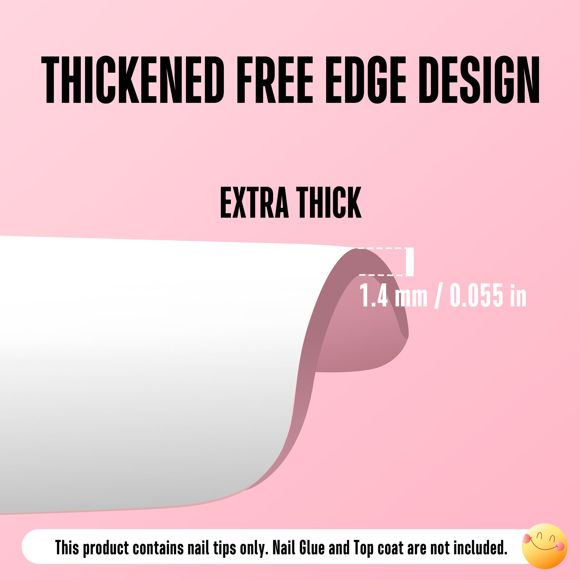 - DOUBLE THICK NAIL TIPS MADE WITH SOFT GEL: These premium-quality nail tips feature an extra-thick finish at the free edge, making them 2-3 times sturdier than standard options, which helps reduce reinforcement costs.They are easy to press,trim,and paint, and are compatible with nail polish,dip powder, and acrylic powder,allowing you to achieve salon-quality manicures and press-on nails. Additionally, they soak off easily,eliminating concerns about over-filing during extension removal.