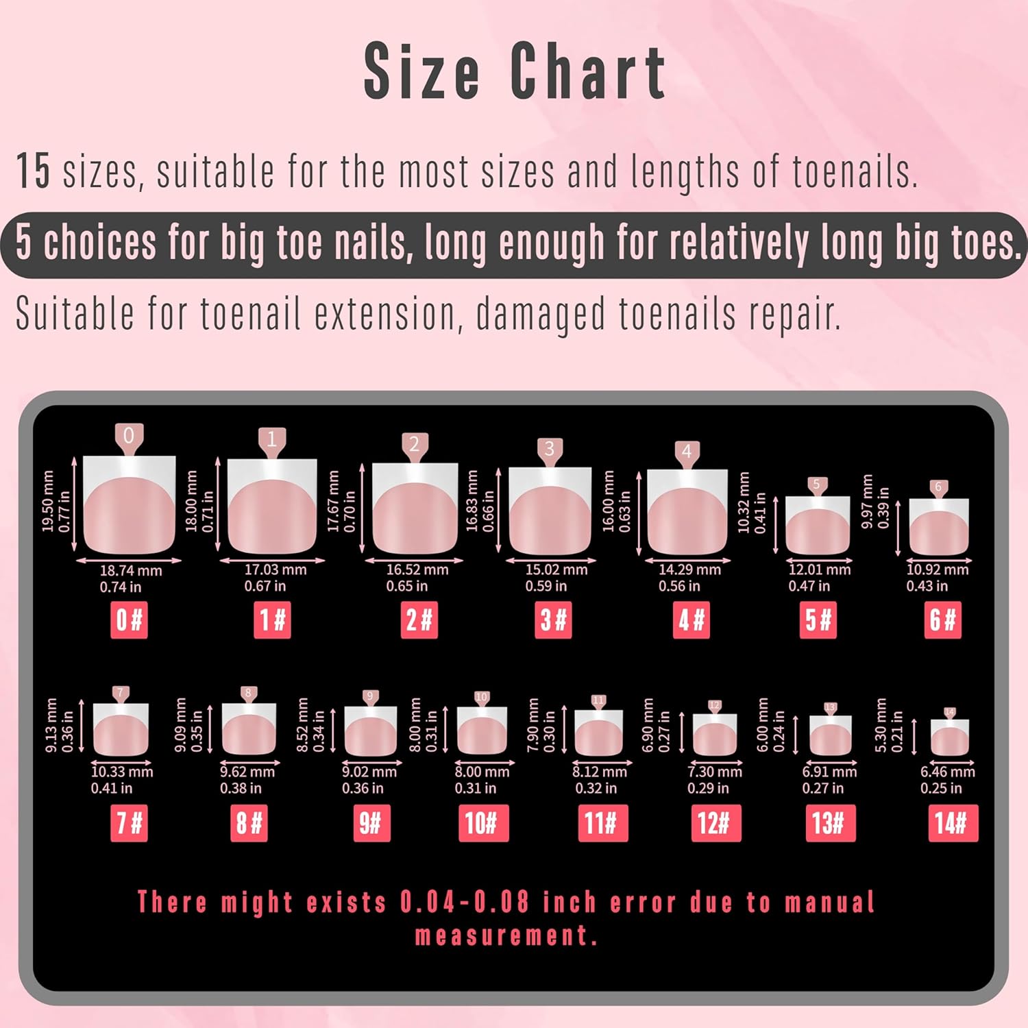 - COMPREHENSIVE SIZE RANGE: With 15 different sizes available for various toes and 5 size options specifically for the big toe, our nail tips are suitable for most foot sizes, especially wide toes, and can even be used by men.