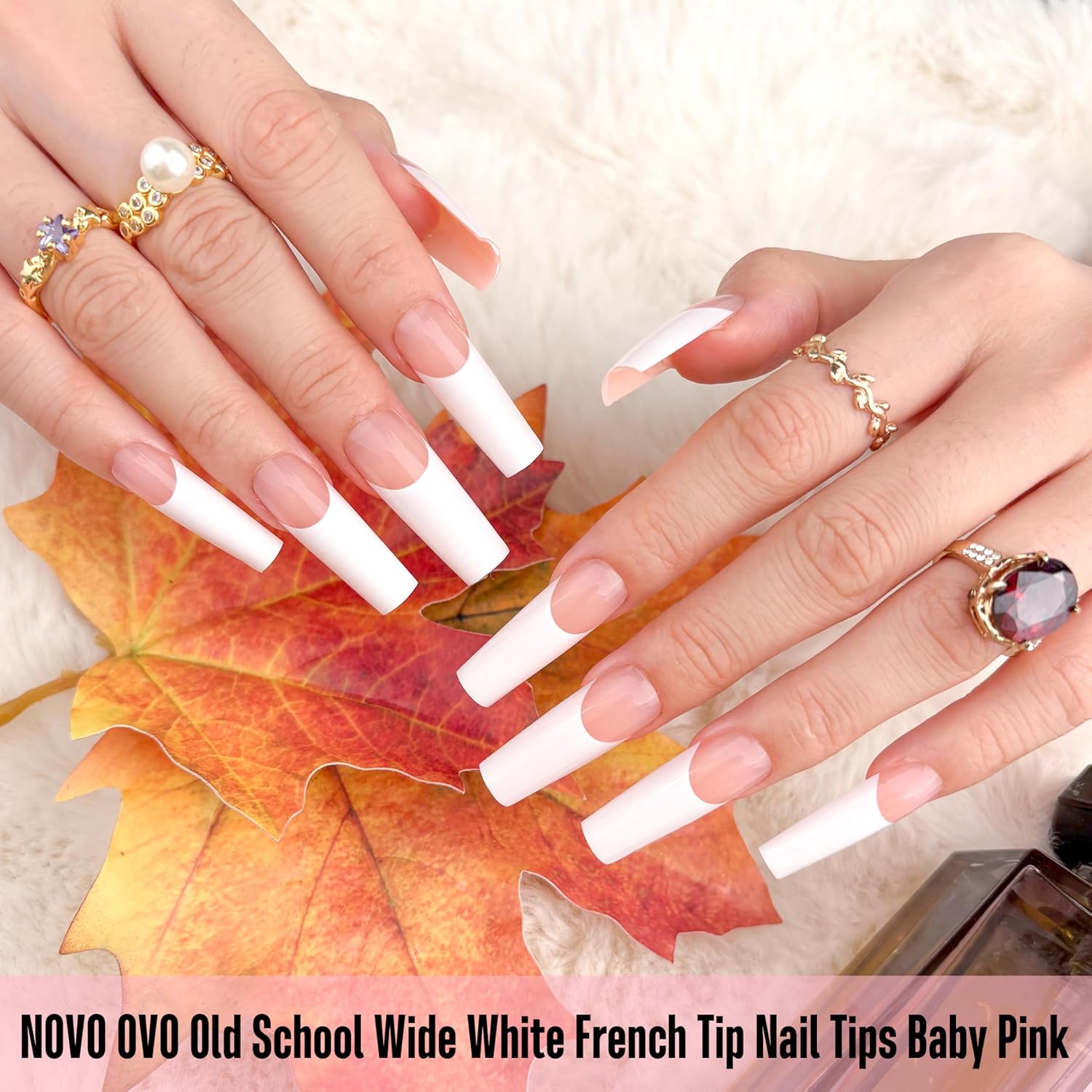 Old School Wide White French Tip Nail Tips Press on, Long Tapered Square BABY PINK, Extra Thick Soft Gel Fake Acrylic Extension, Need Builder Gel Top Coat & Glue, 15 Sizes 240 pcs