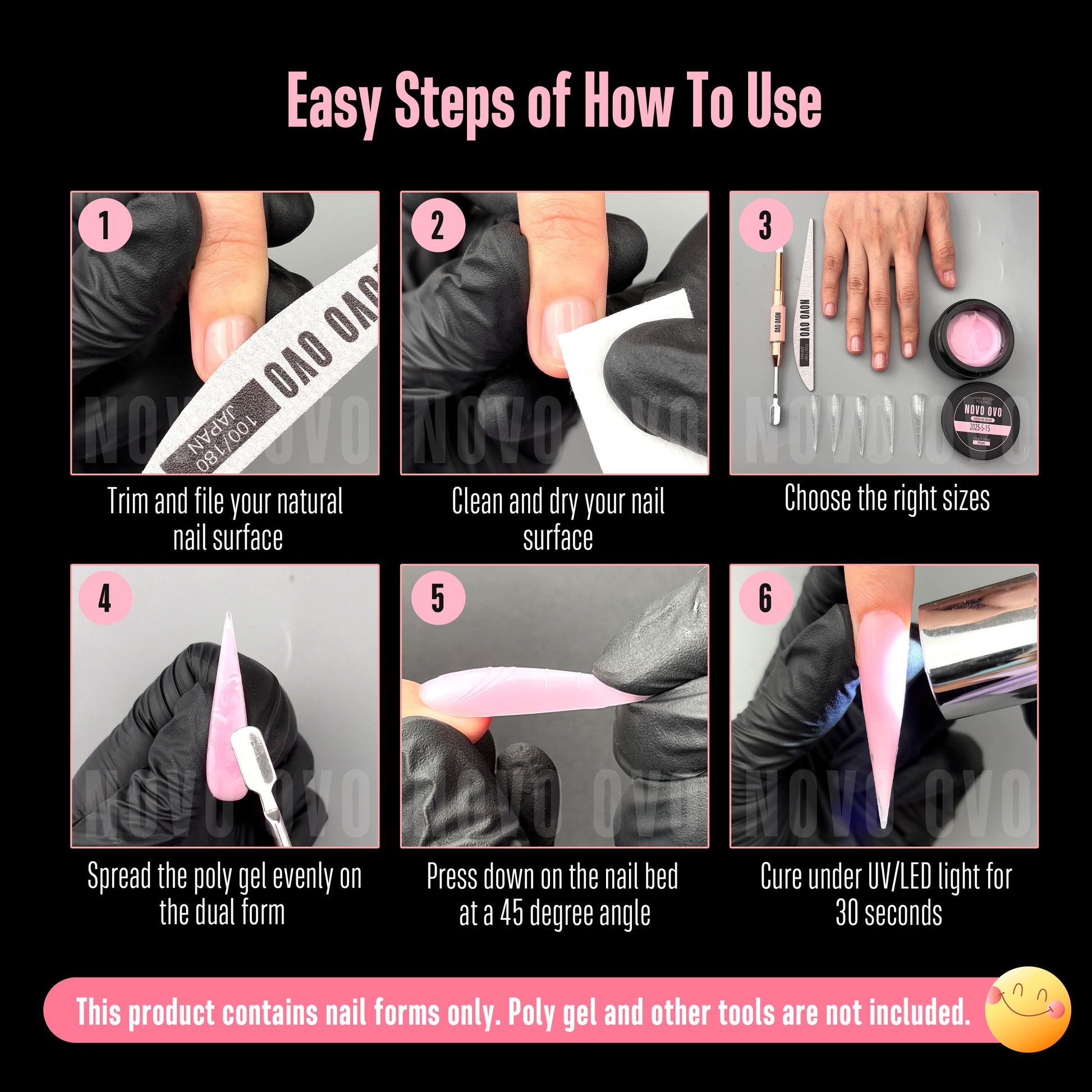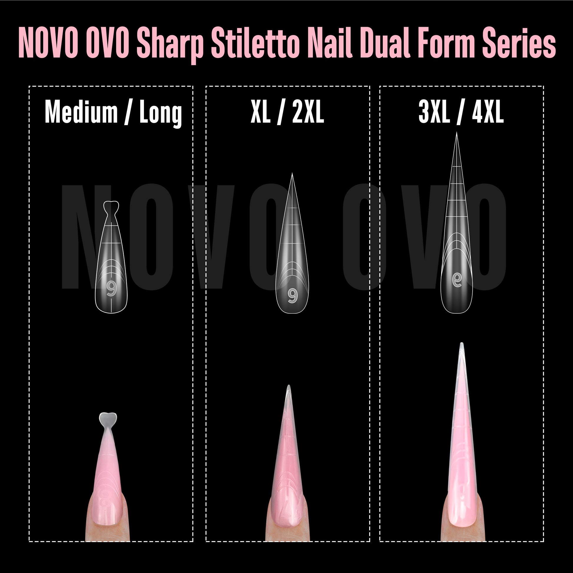 THE WORLD'S FIRST XXL SHARP STILETTO DUAL FORM: At the demand of our clients—nail artists and DIY enthusiasts who embrace the latest trends—NOVO OVO is excited to unveil this innovative sharp stiletto dual form. Effortlessly create stunning nails that are ideal for holiday parties and spooky festivities by filling the forms with poly gel, harder gel or builder gel positioning them on your nail, curing, and simply popping them off for a flawless 3D astonishing finish.