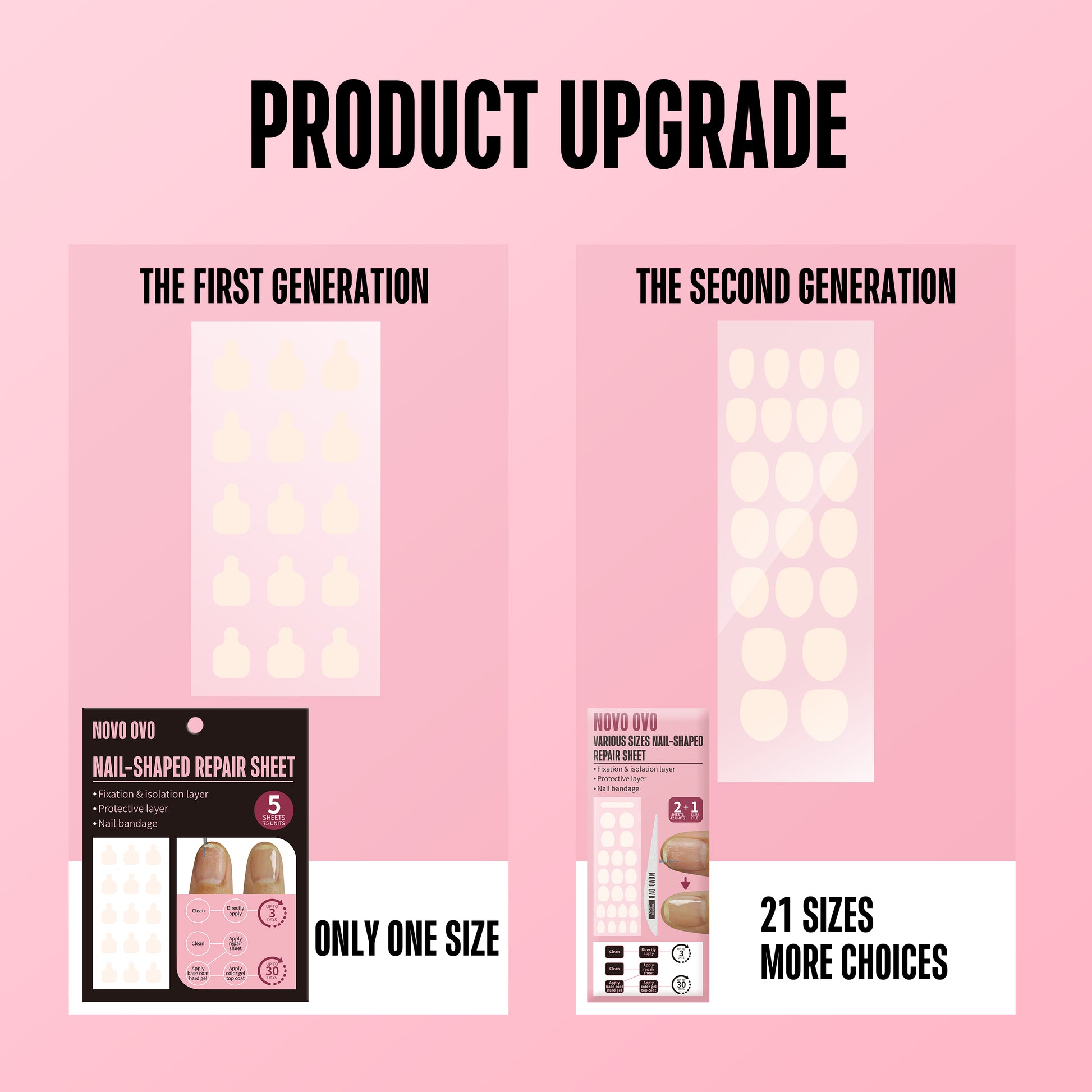 NOVO OVO Pre-cut Nail Shaped Repair Sheets Various 21 Sizes with Slim File, Fixation & isolation layer, Bandage for Broken Nail-Surface, Recovery Protective layer for Acrylic, Easy to use 42 units