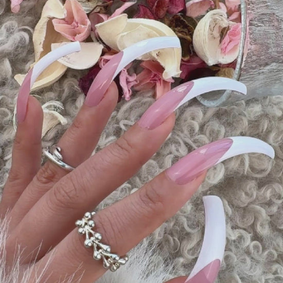 White XXL Curved Square White French Tip Nail Tips Press on BERRY PINK, Full Cover Extra Thick Long XL Acrylic Hawk Curve Fake Extension Kit, Need Top Coat for Salon DIY 12 Sizes 144 pcs